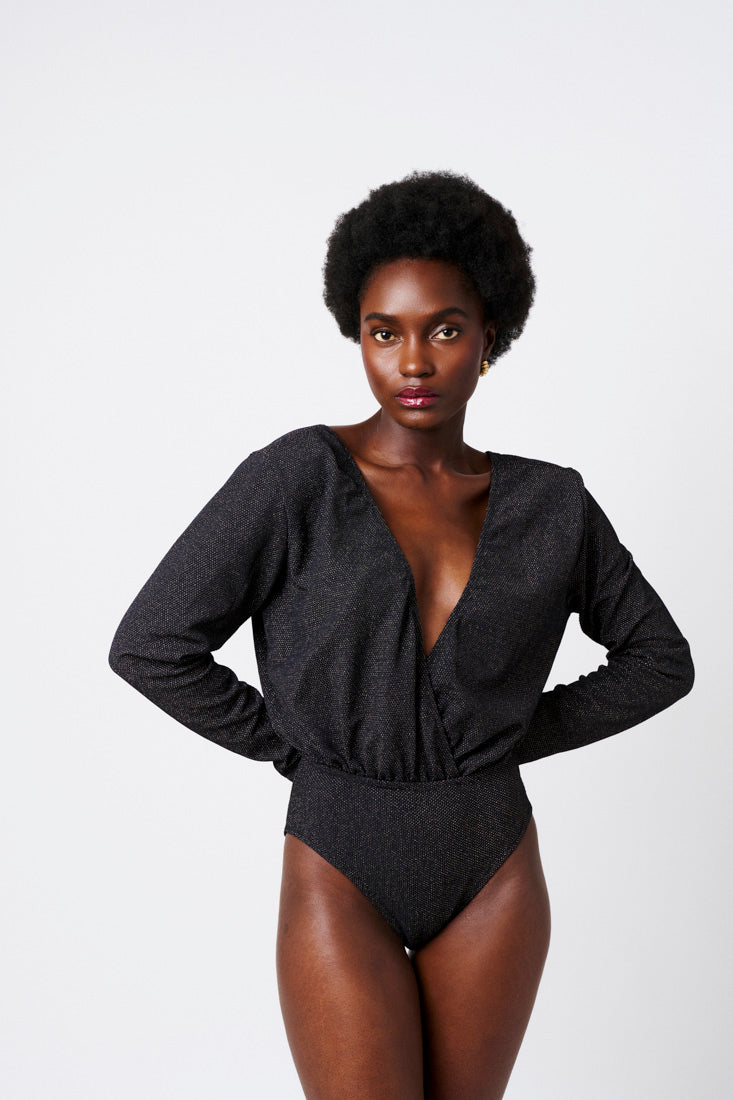 - Coupe : Body manches longues, décolleté croisé et dos ouvert.